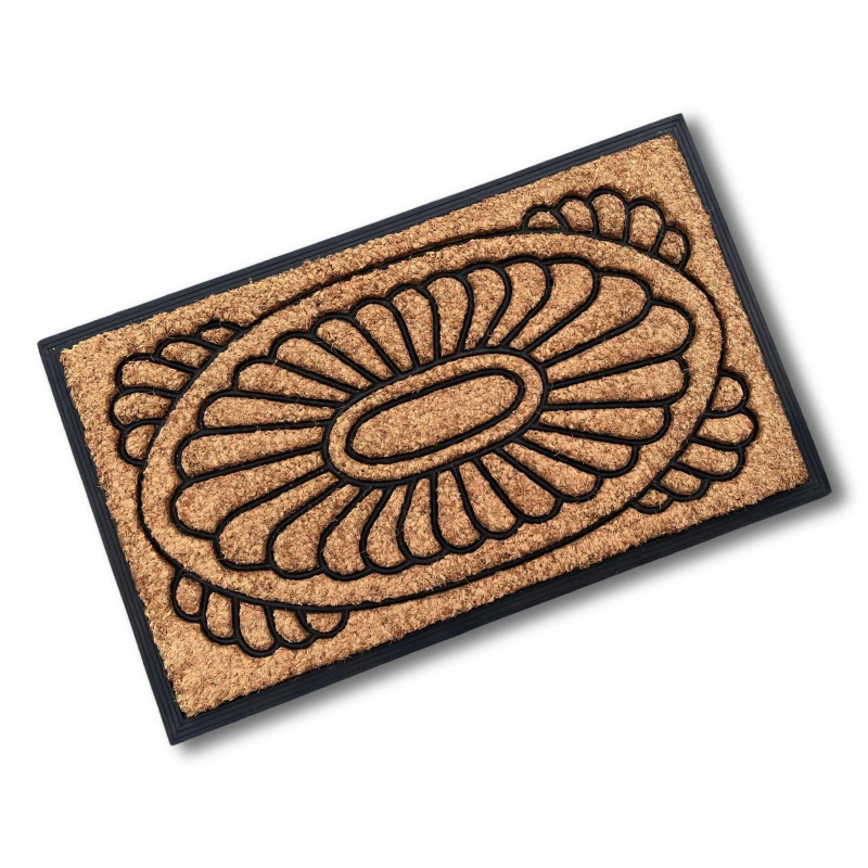 It has a 100% rubber border and backing, along with coir inserts arranged in a floral pattern, ensuring it can withstand heavy foot traffic while efficiently trapping debris. The coir inserts within the doormat are designed to efficiently trap pieces of mud and dirt and the heavy rubber backing helps keep the mat in place.